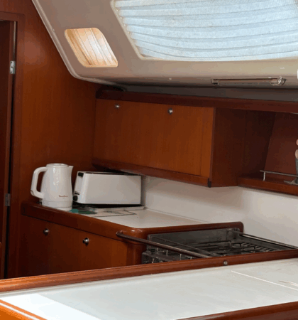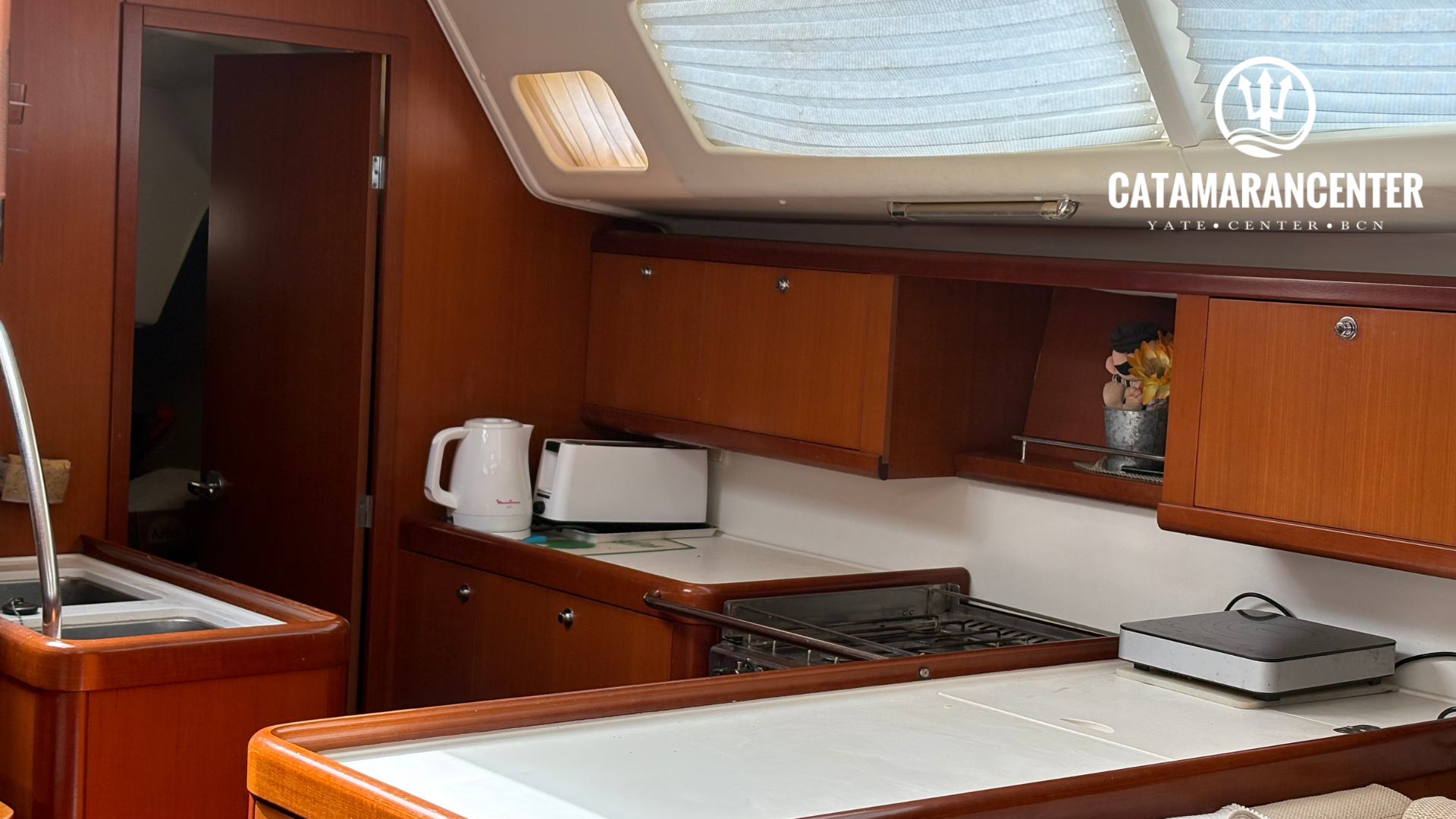 La embarcación dispone de un interior totalmente equipado para largas estancias a bordo, con sistema de agua caliente mediante acumulador de 40 litros, doble nevera y cocina completa con cuatro fuegos, horno, placa de inducción y fregadero con grifo de agua salada, ofreciendo máxima funcionalidad y comodidad en navegación.