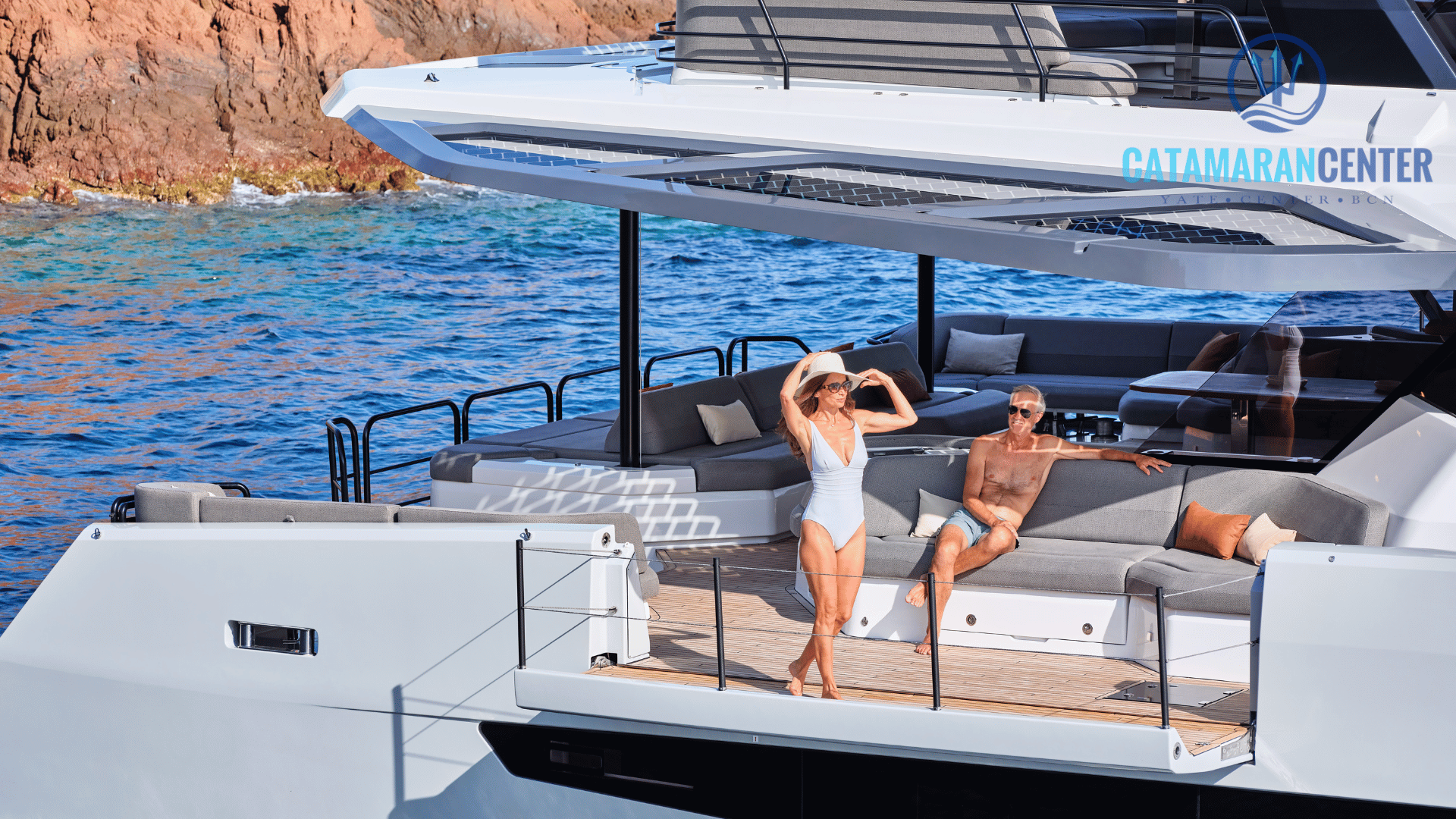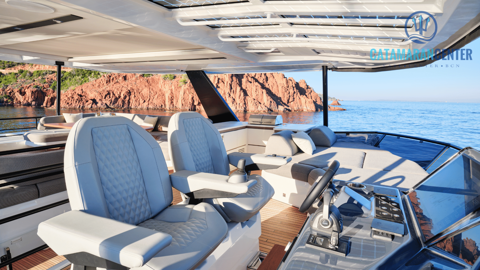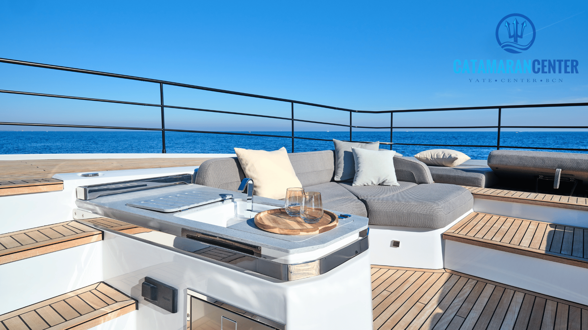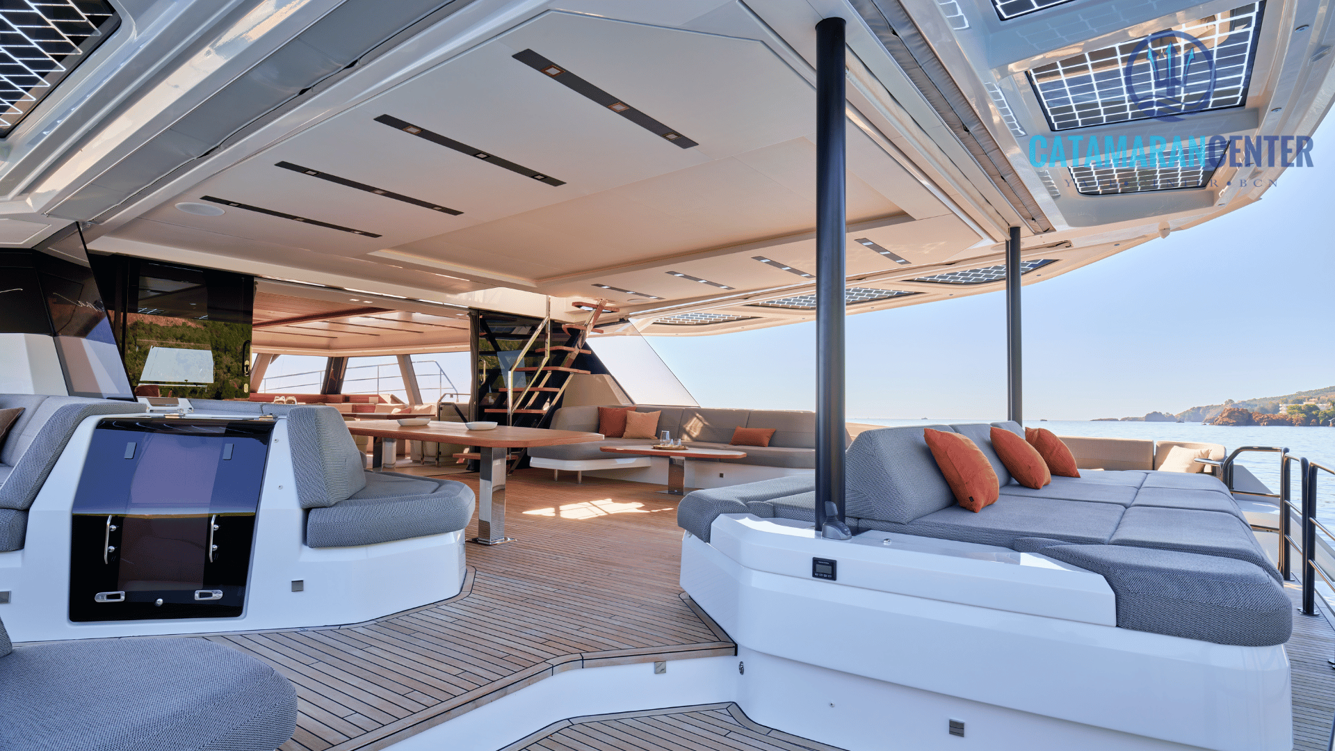 El flybridge, de grandes dimensiones, alberga el puesto de gobierno principal junto con amplias zonas lounge y espacios dedicados al descanso y la observación durante la navegación. En la zona de proa, el cockpit delantero ofrece sofás, áreas de solárium y espacios protegidos para el fondeo, completando una distribución exterior equilibrada, segura y especialmente pensada para disfrutar del catamarán tanto en navegación como fondeado.