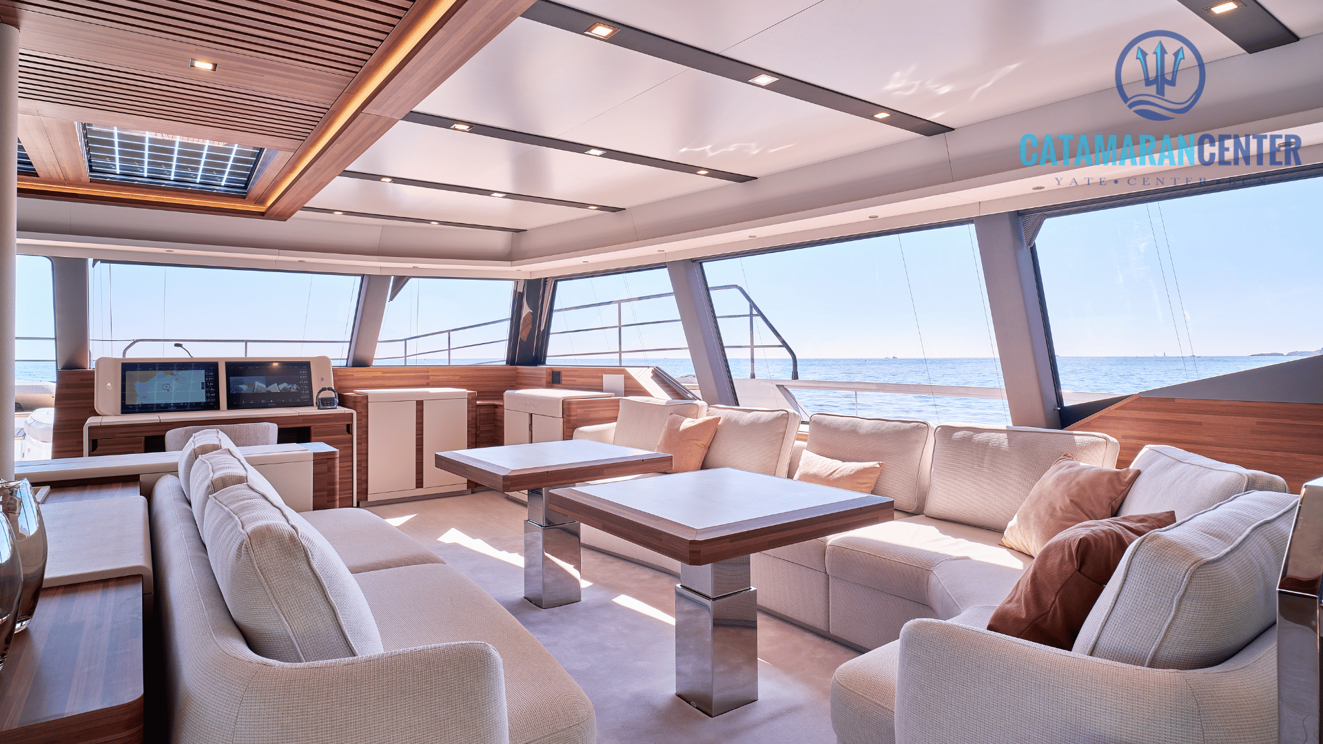 El interior del Power 80 refleja el ADN de Fountaine Pajot en materia de diseño contemporáneo y calidad constructiva. Los amplios volúmenes interiores se ven reforzados por grandes ventanales panorámicos que aportan una luminosidad excepcional al salón principal y a las zonas comunes. La sensación de espacio y continuidad visual crea un ambiente sofisticado y relajado, propio de un yate de lujo.