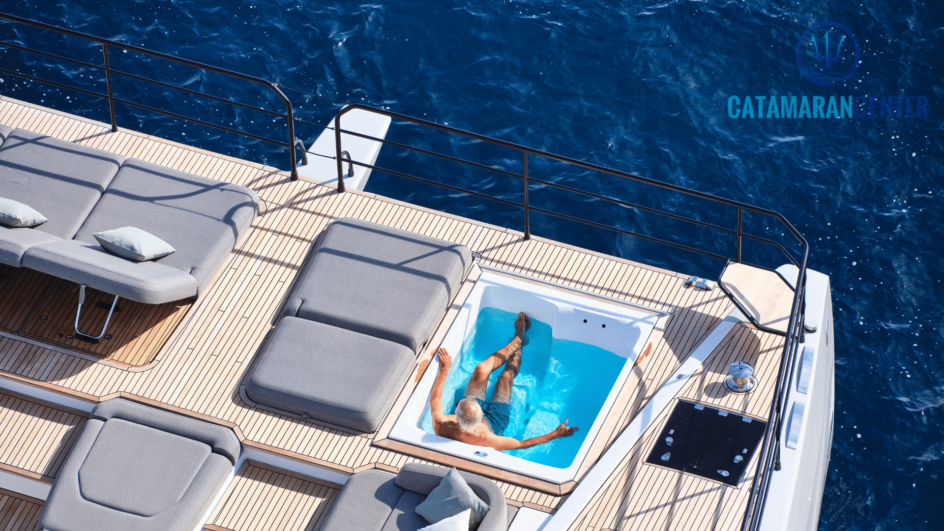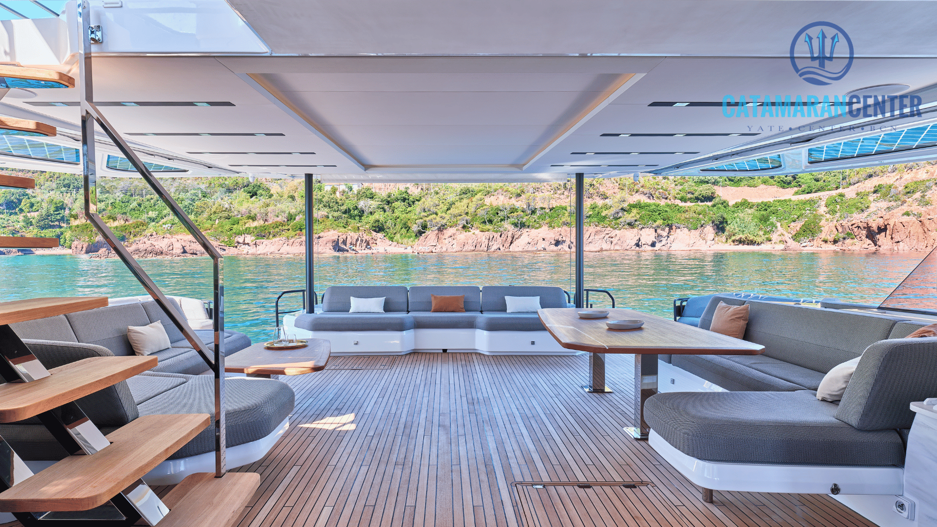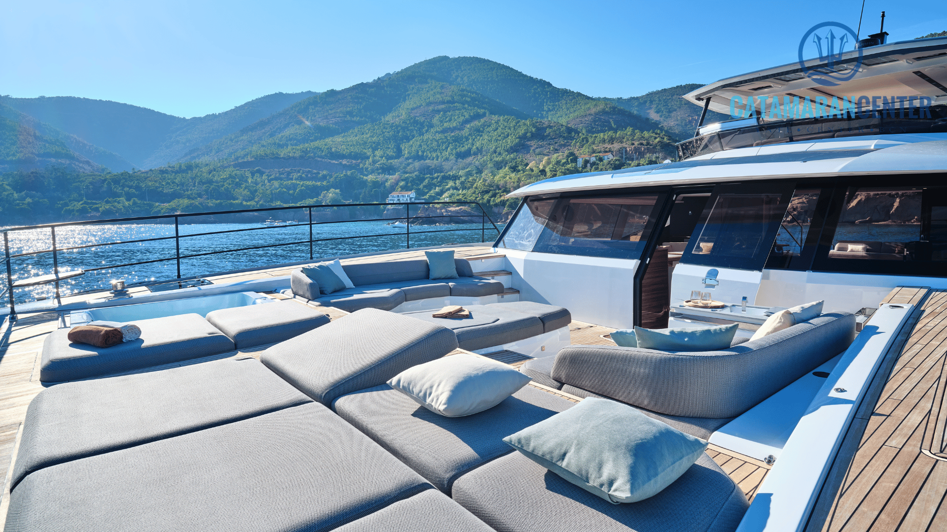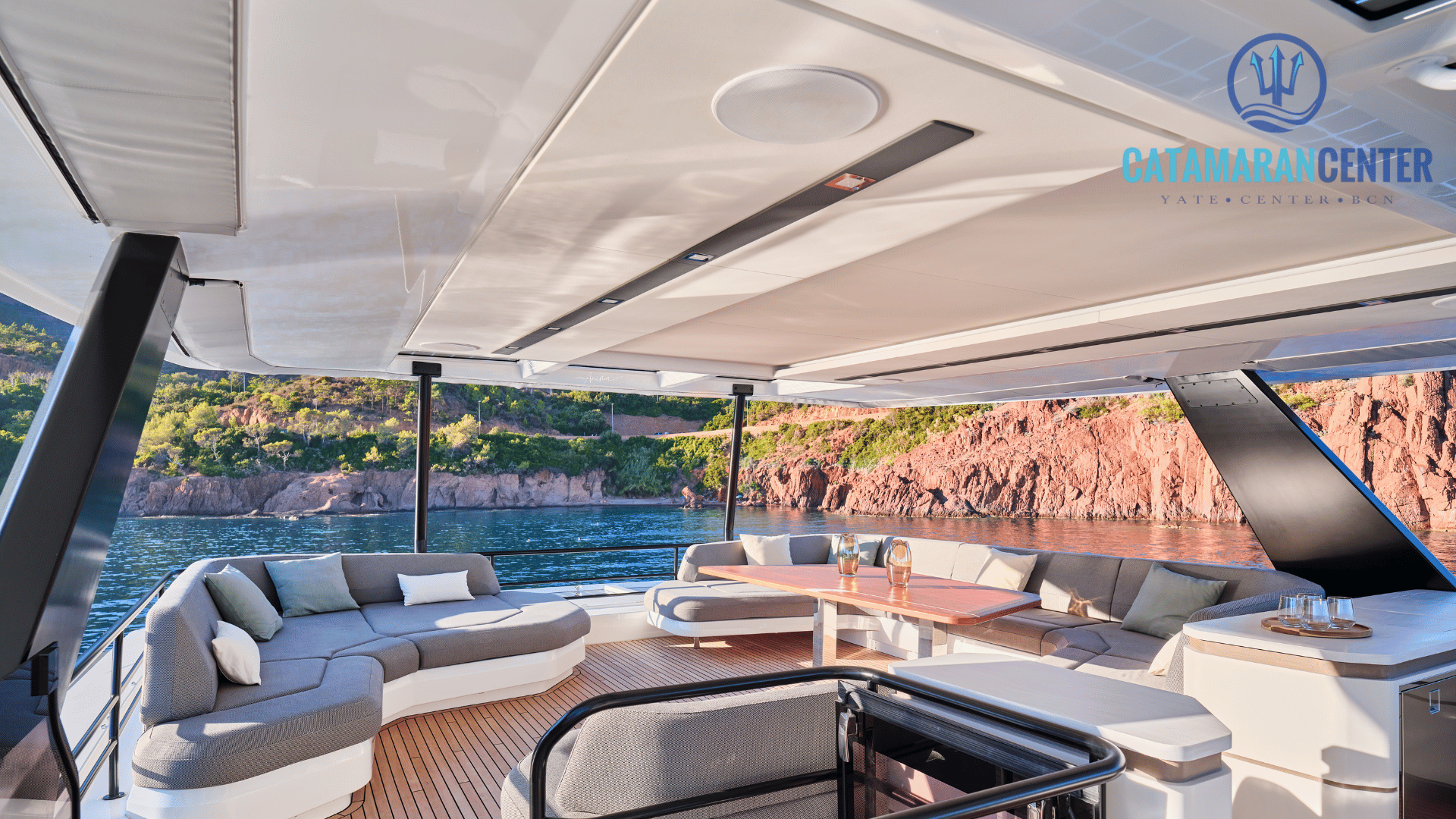 Las zonas exteriores están concebidas para maximizar el disfrute en navegación y fondeo. La amplia bañera de popa, las zonas de solárium, el cockpit de proa y el flybridge de grandes dimensiones convierten al Power 80 en un catamarán especialmente orientado al confort, el relax y la convivencia a bordo, tanto en navegación como en puerto.