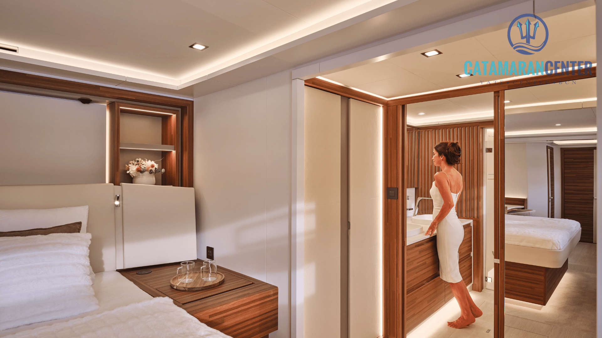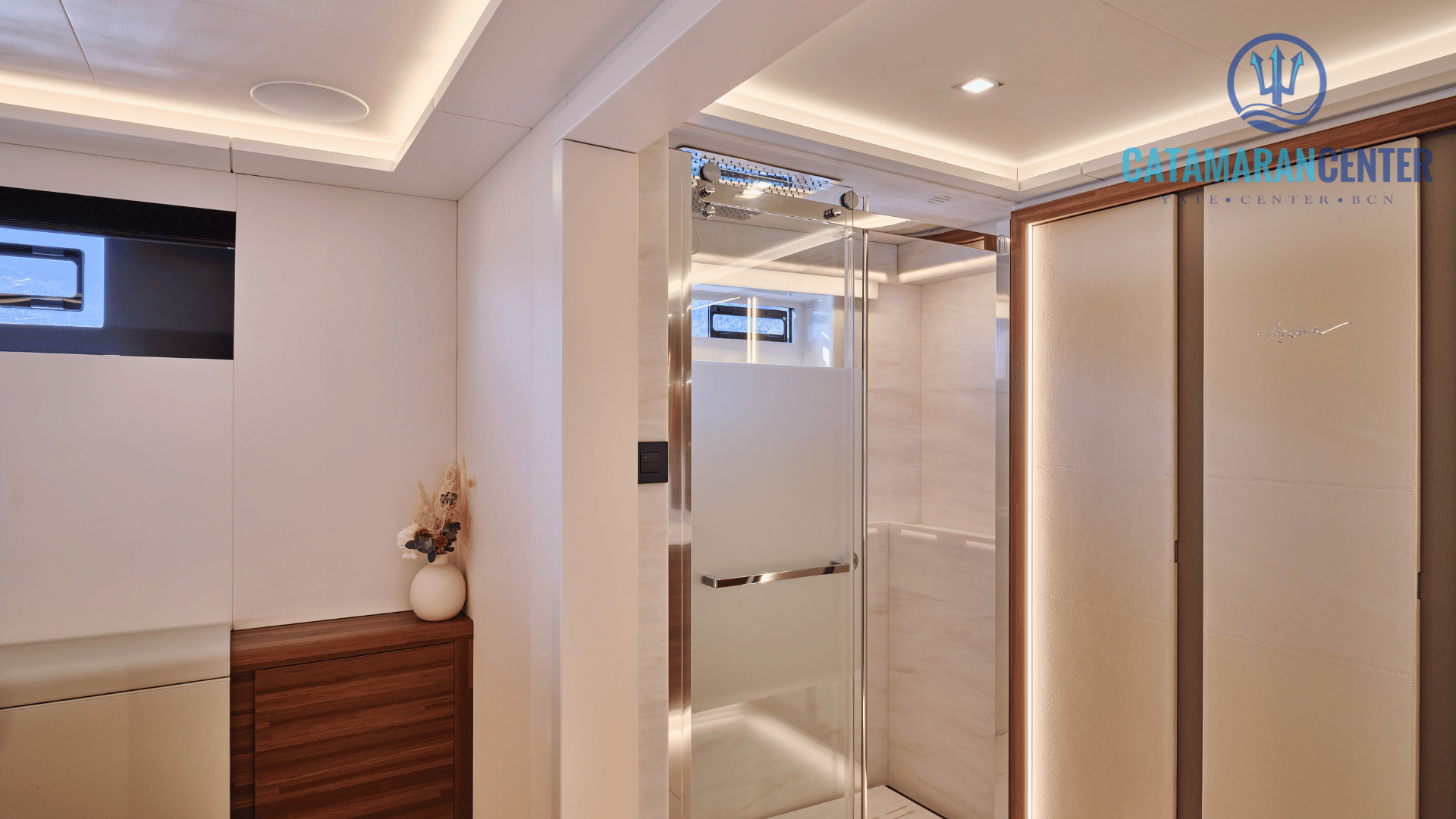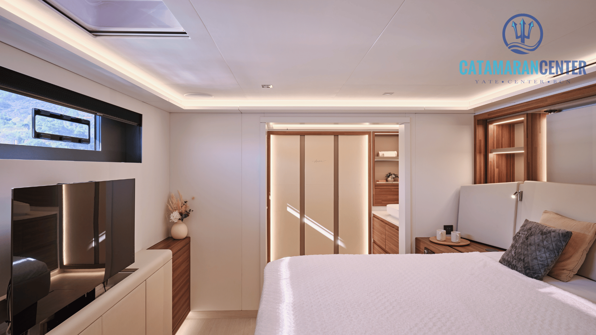La distribución interior permite múltiples configuraciones, adaptándose a las necesidades del propietario. El catamarán puede disponer de una amplia suite de armador, cabinas VIP y camarotes dobles para invitados, todas ellas con baño privado. Los espacios están diseñados para ofrecer privacidad, confort y funcionalidad, tanto en navegación como en estancias prolongadas a bordo.