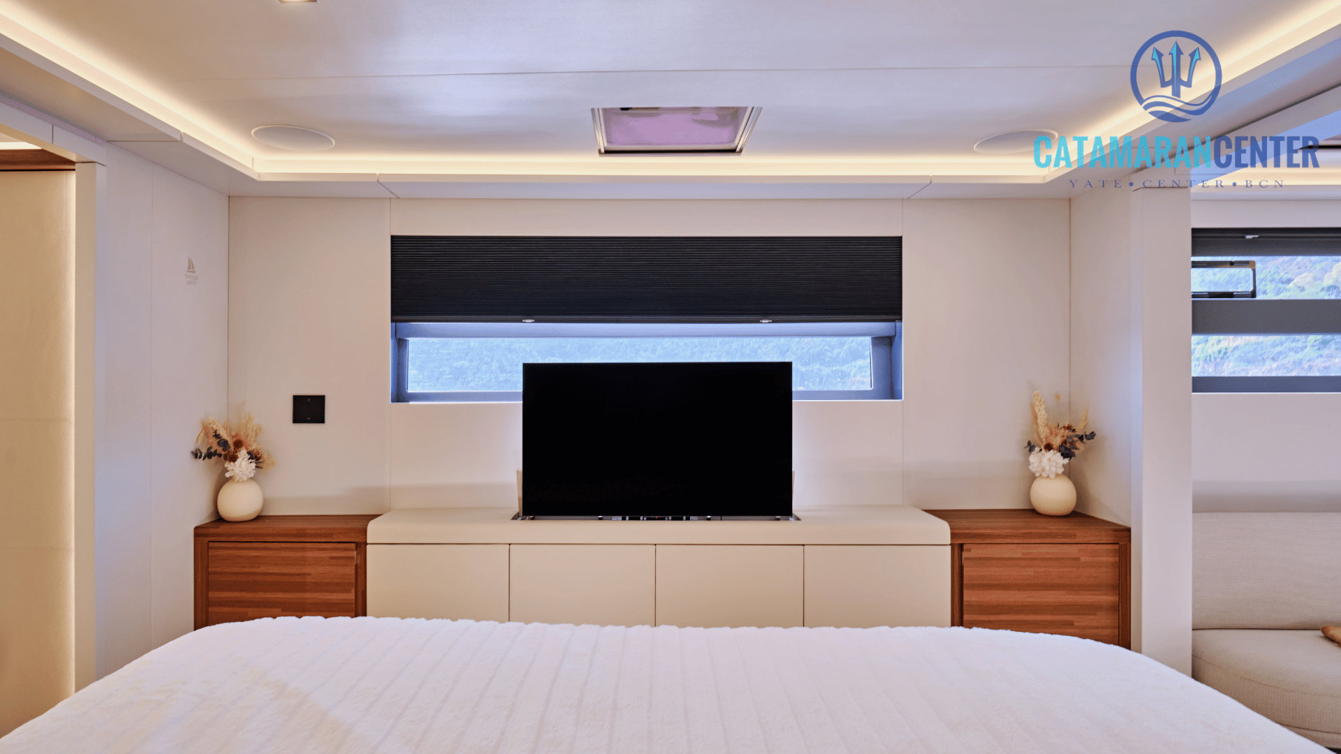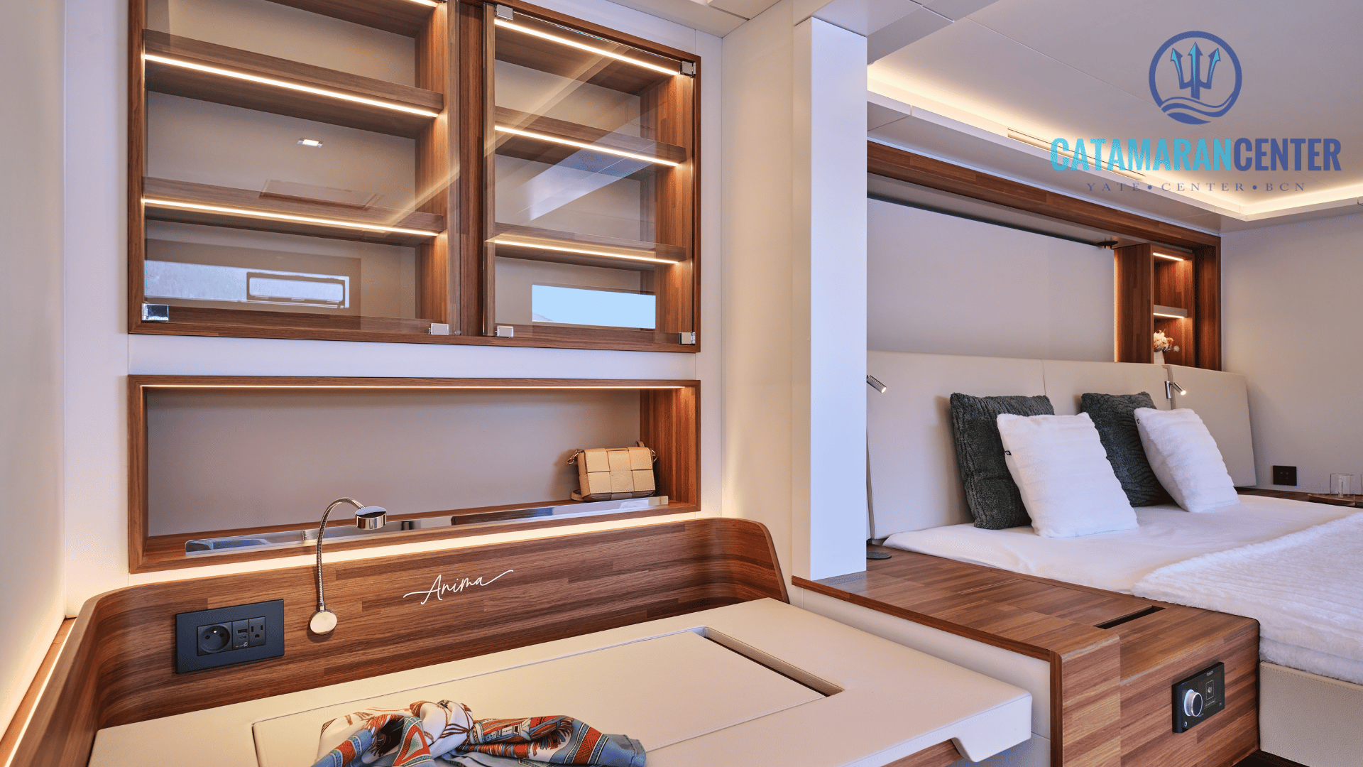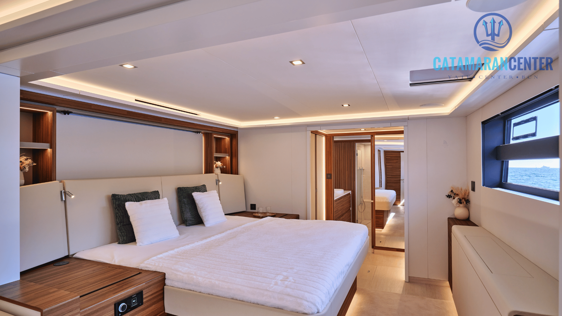 La distribución interior permite múltiples configuraciones, adaptándose a las necesidades del propietario. El catamarán puede disponer de una amplia suite de armador, cabinas VIP y camarotes dobles para invitados, todas ellas con baño privado. Los espacios están diseñados para ofrecer privacidad, confort y funcionalidad, tanto en navegación como en estancias prolongadas a bordo.