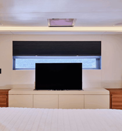 La suite de armador en proa ha sido diseñada como un auténtico apartamento privado a bordo. Dispone de un amplio dormitorio con cama de gran formato, zonas de almacenamiento generosas, vestidor independiente y un baño en suite de grandes dimensiones. La disposición favorece la privacidad, el silencio y una excelente iluminación natural, reforzada por una ventilación cuidada y una sensación de espacio poco habitual incluso en embarcaciones de esta eslora.
