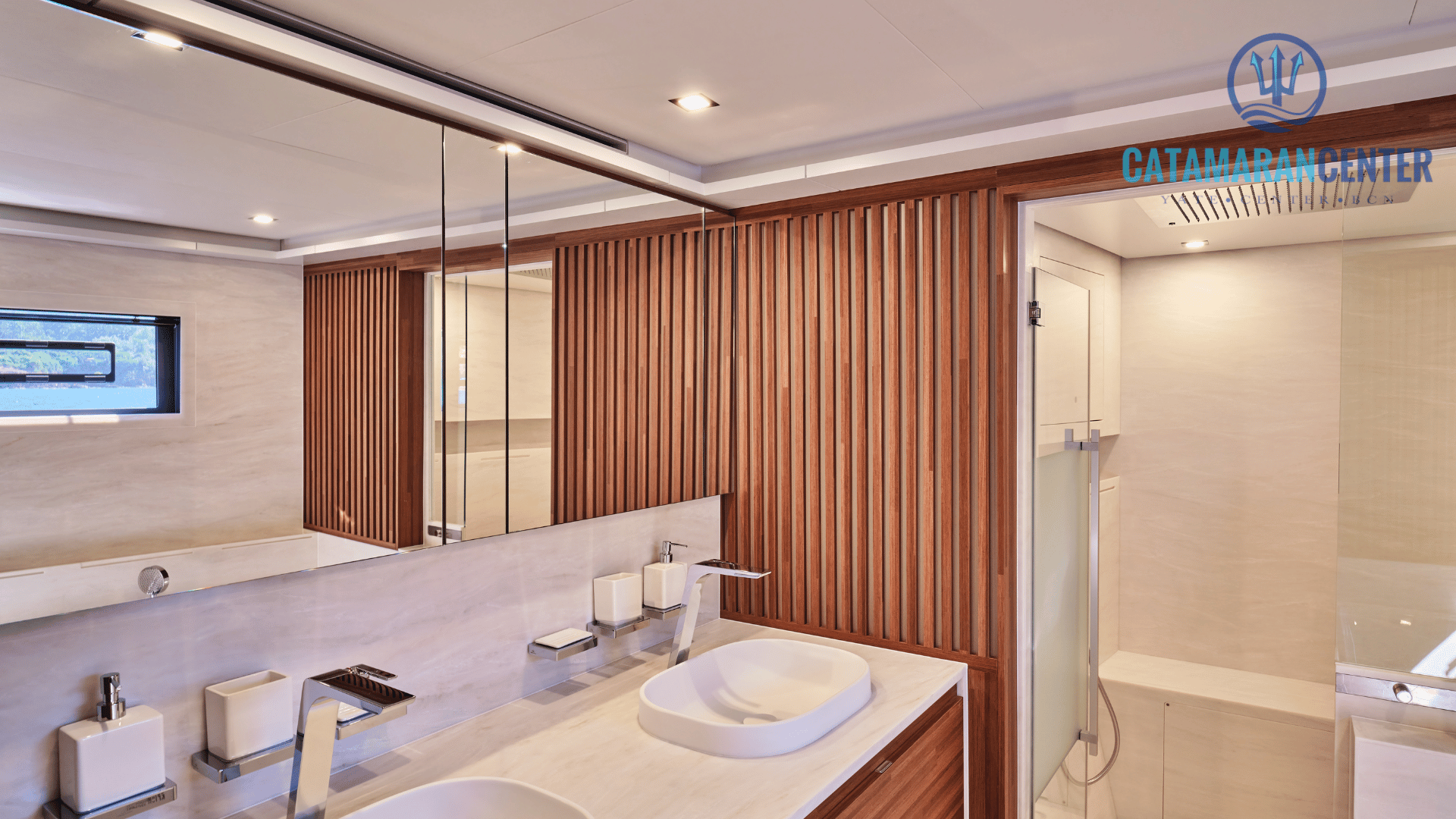 El baño del armador cuenta con acabados de alta calidad, doble lavabo, compartimento de inodoro independiente y una amplia ducha separada. El conjunto ofrece un nivel de confort, funcionalidad y exclusividad propio de un yate de gran tamaño, pensado para un uso intensivo y prolongado.