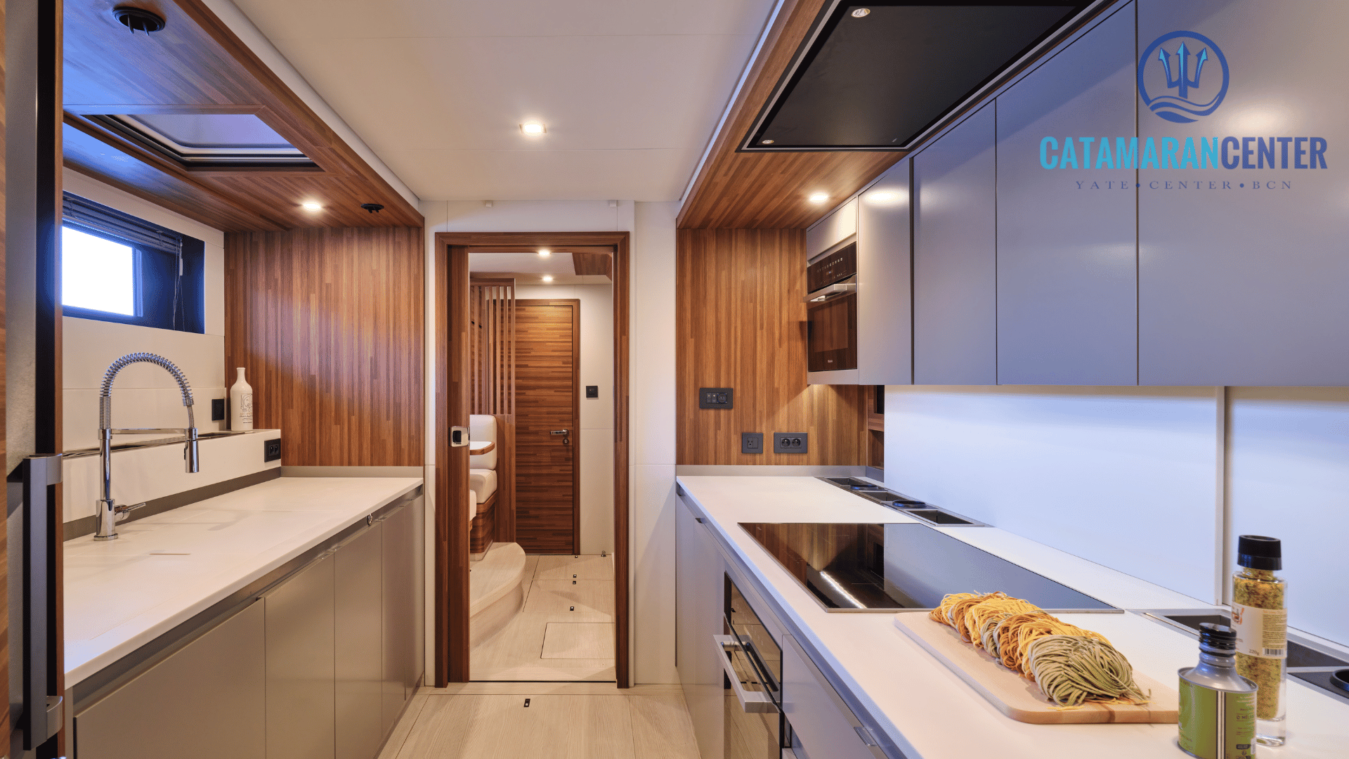La cocina se dispone en el casco (galley down), una solución que permite liberar completamente el salón principal, reforzando la sensación de amplitud y creando un espacio central dedicado exclusivamente a la vida social, el descanso y la convivencia a bordo. Esta distribución optimiza la circulación interior y mantiene una clara diferenciación entre zonas privadas y zonas comunes, ideal para estancias prolongadas y navegación de largo recorrido.
