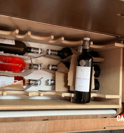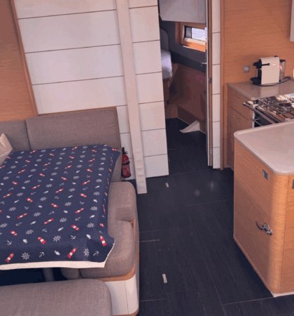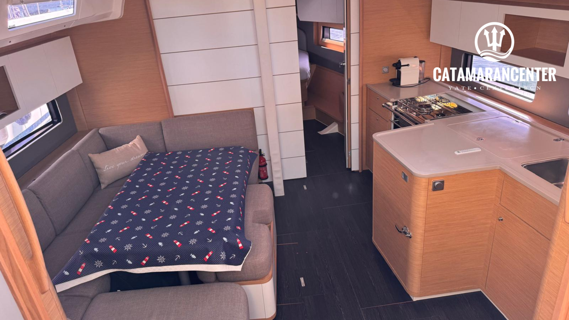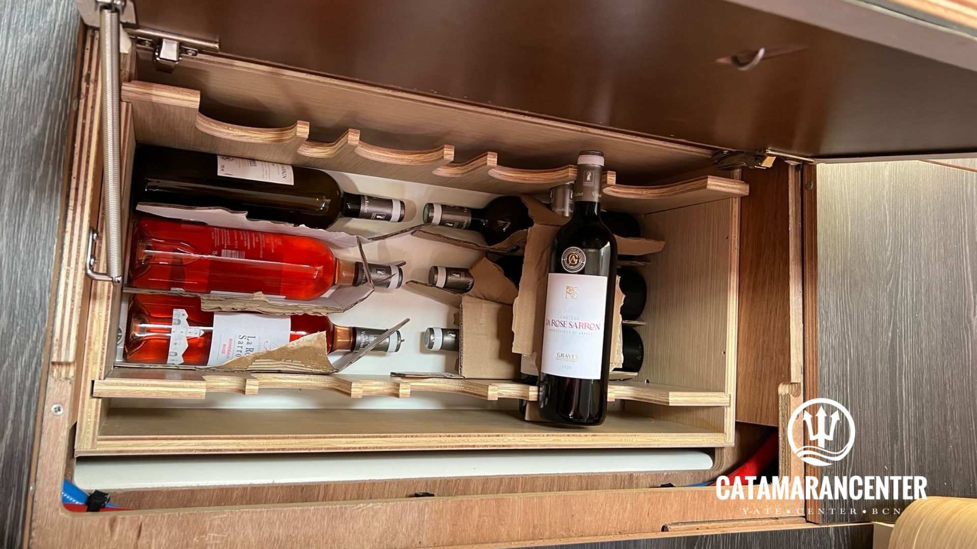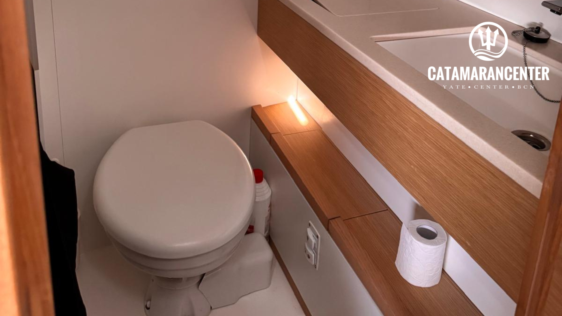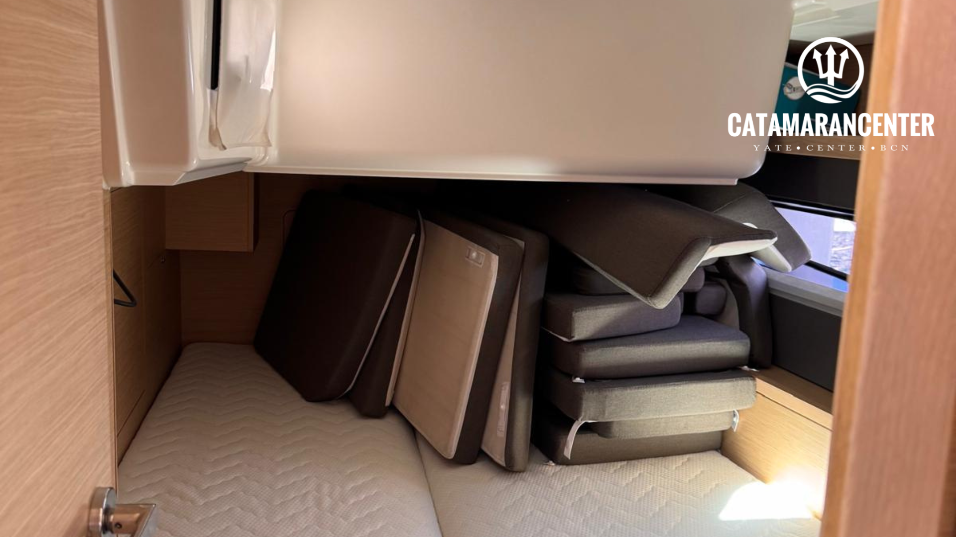La embarcación dispone de cocina longitudinal equipada, calentador de agua de 40 litros, iluminación LED completa, cava de vino en madera, cargadores inalámbricos en cabinas y múltiples espacios de almacenamiento, ofreciendo máxima comodidad a bordo.